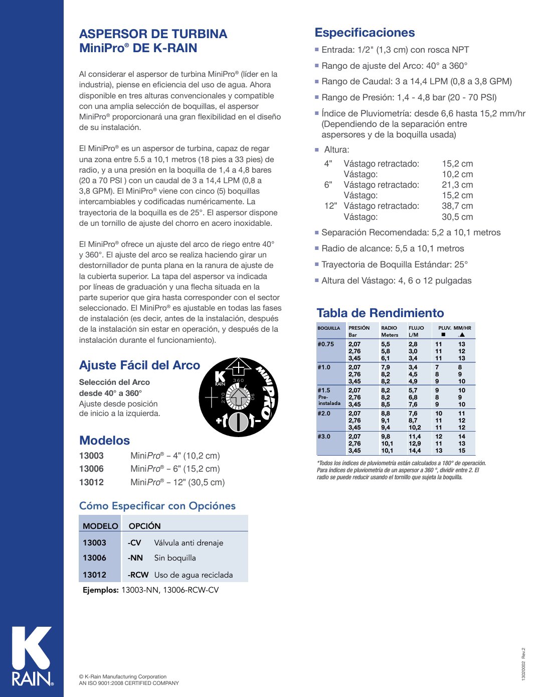Rango de Caudal: 3 a 14,4 LPM (0,8 a 3,8 GPM)