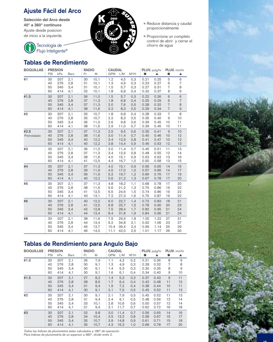 - Ángulo de riego: Ajustable de 40° a 360°