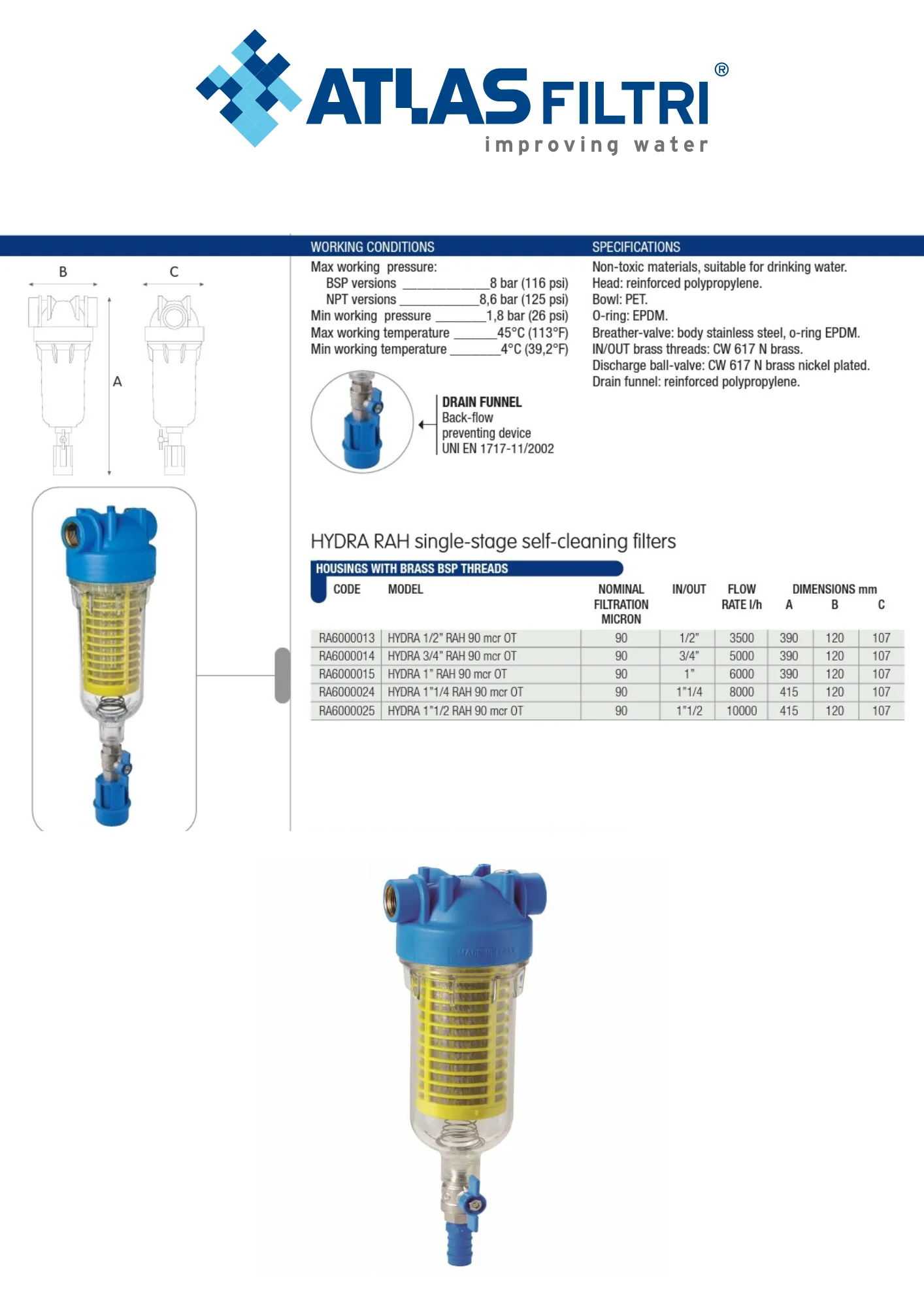 Modelos RAH con cartucho de malla de acero inoxidable, filtración a 90 micras.